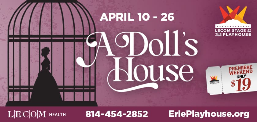 Nominated for six Tony Awards, the Erie Playhouse presents the shocking Ibsen classic A DOLL’S HOUSE, adapted and stripped to vibrant, contemporary relevance by acclaimed playwright Amy Herzog. On stage April 10 – 26, A DOLL’S HOUSE features Bunny Manchester and Jim Nash as Nora and Torvald Helmer; JP Driscoll as Nils Krogstad, Karl Seman…